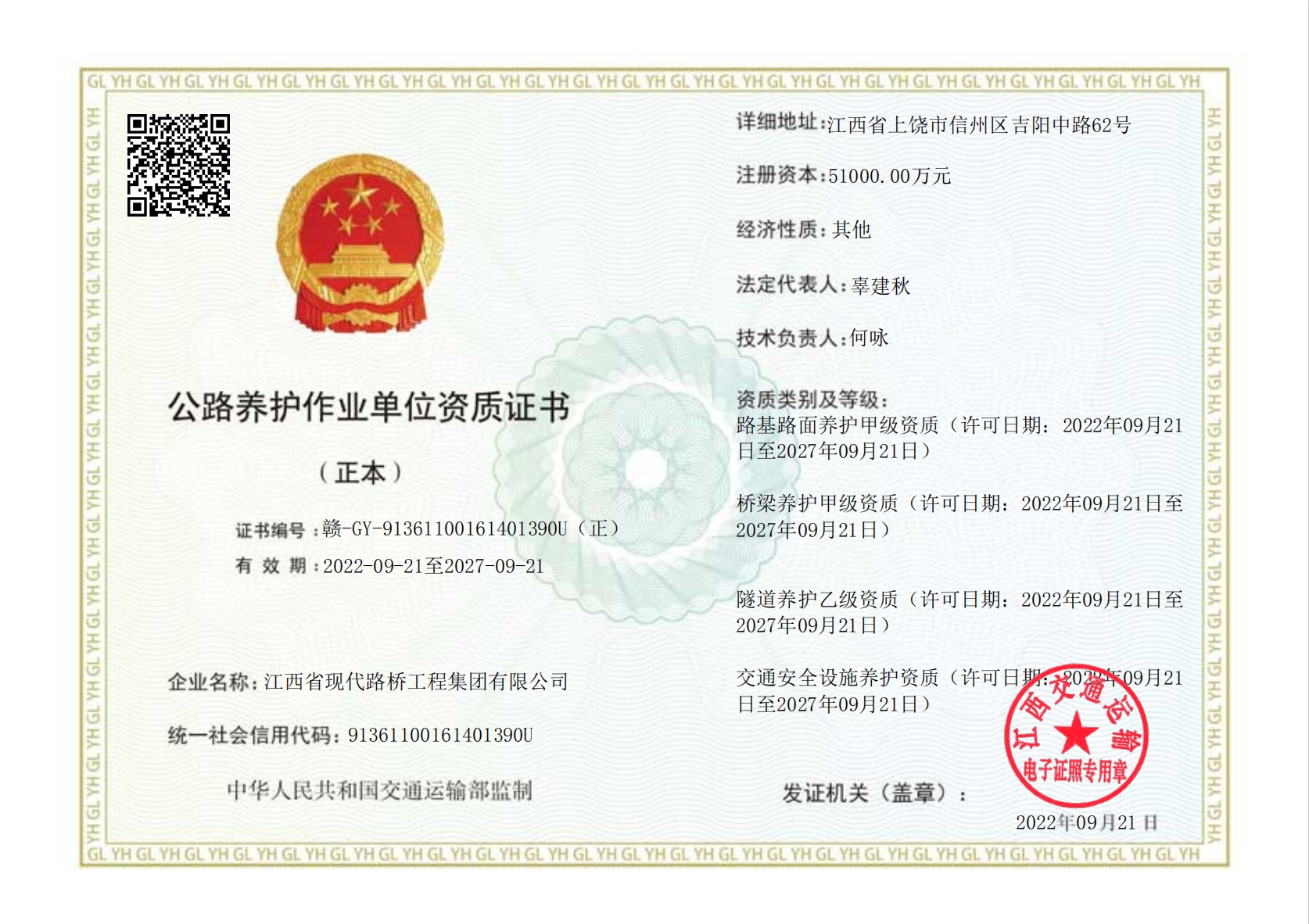 公路養(yǎng)護(hù)作業(yè)單位資質(zhì)證書